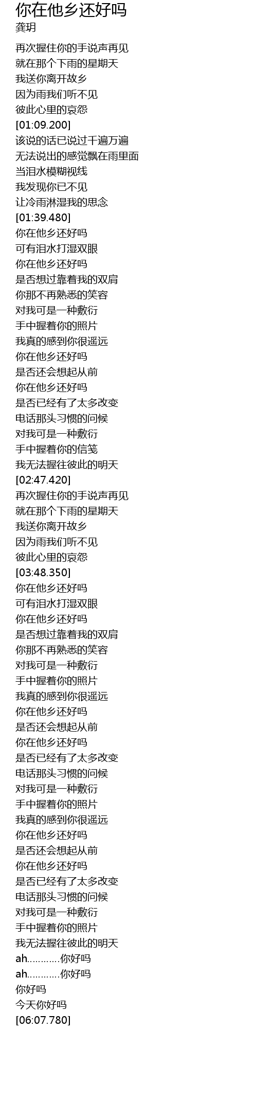 | [01:51.430] | nǐ zài tā xiāng hái hǎo ma |