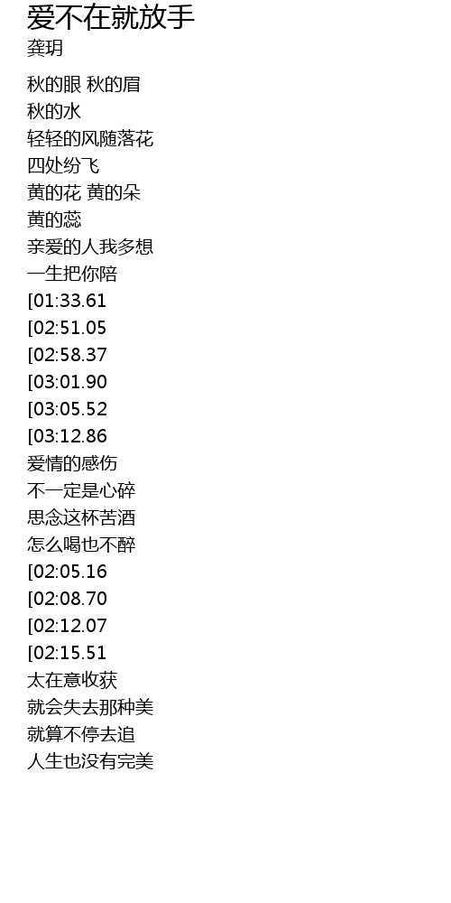 | [01:50.53][02:05.16][03:36.56][03:51.29] | 爱不在就放手 |