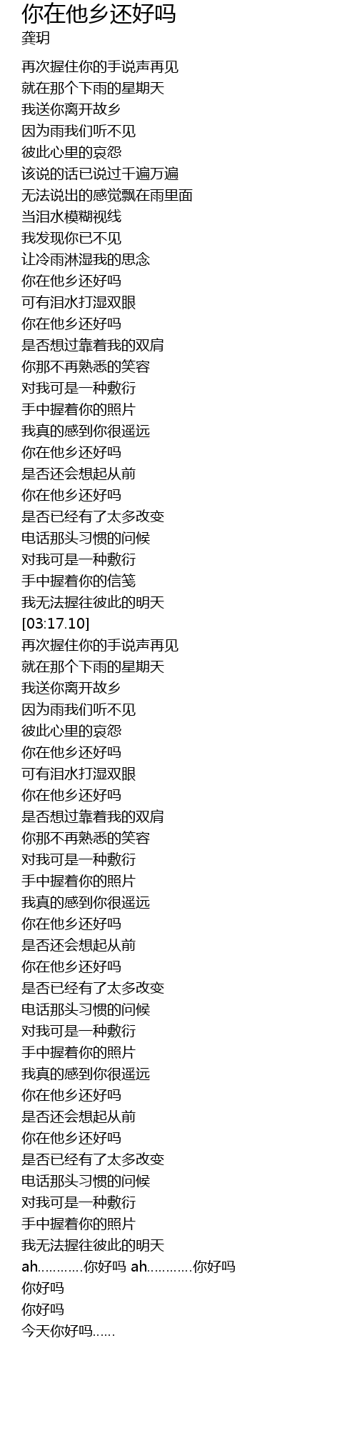 | [02:47.14] | nǐ zài tā xiāng hái hǎo ma |
