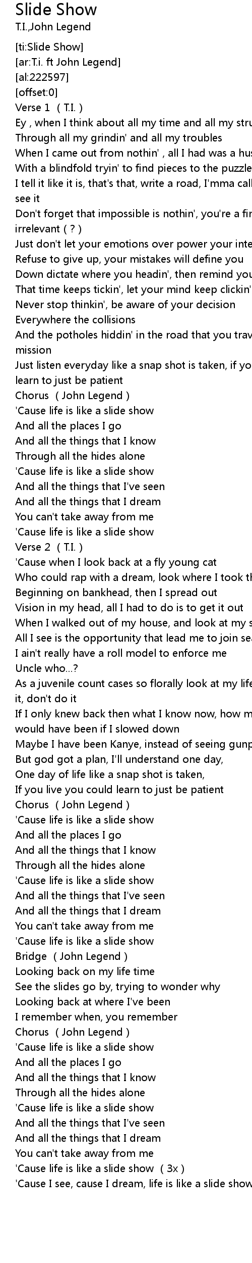 | [02:59.76] | 'Cause life is like a slide show (3x) |