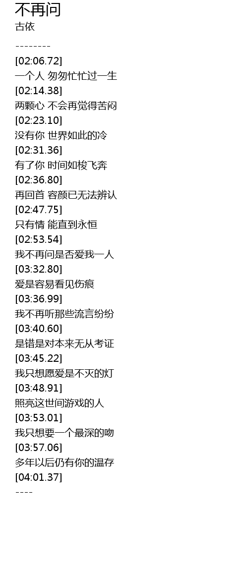 | [01:17.00] | wǒ bù zài wèn shì fǒu ài wǒ yī rén |