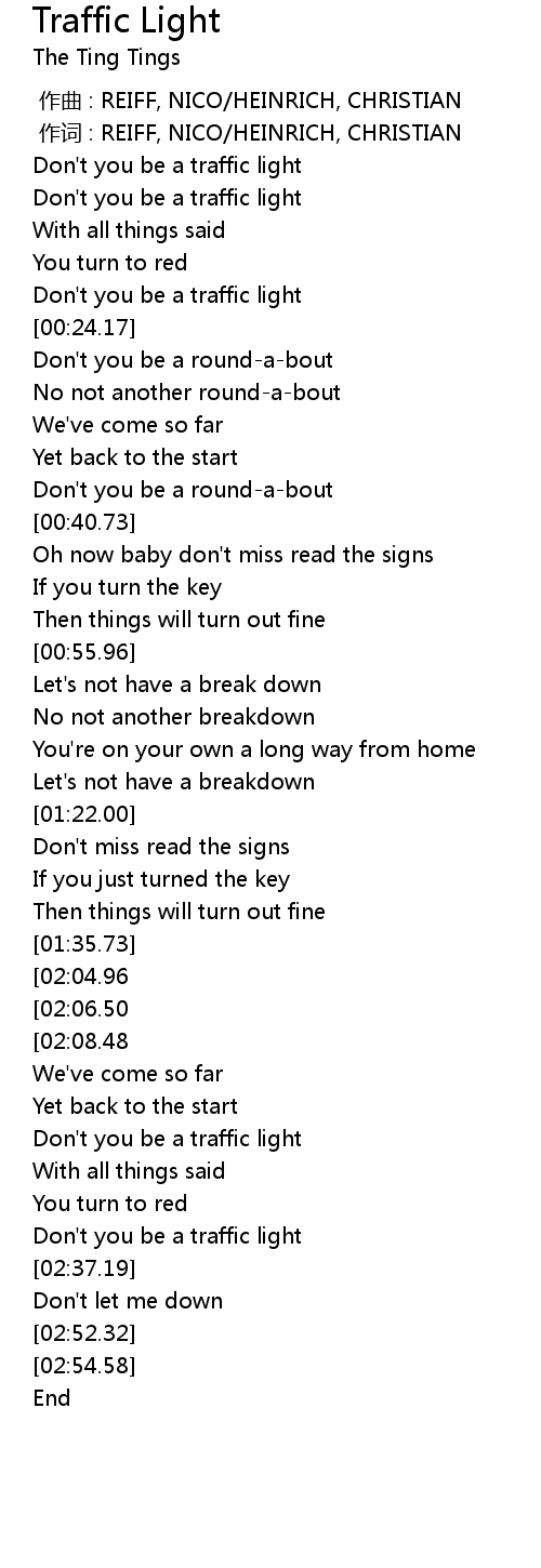 | [00:12.58] | Don' t you be a traffic light |