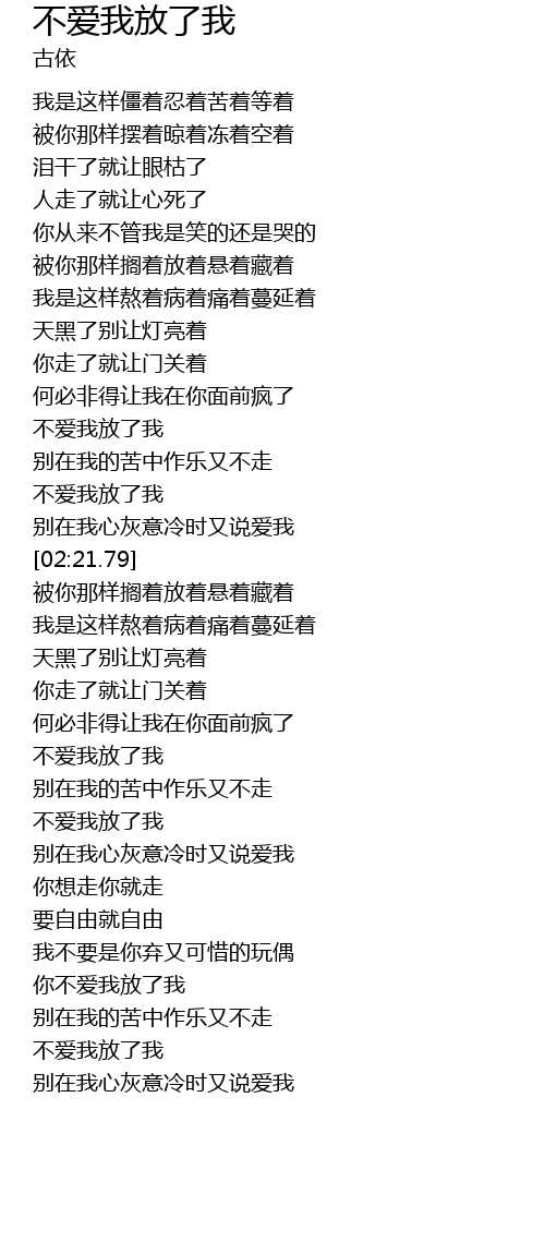 | [01:42.75] | 别在我的苦中作乐又不走 |