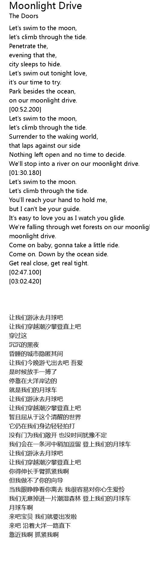 | [01:21.810] | We' ll stop into a river on our moonlight drive. |
