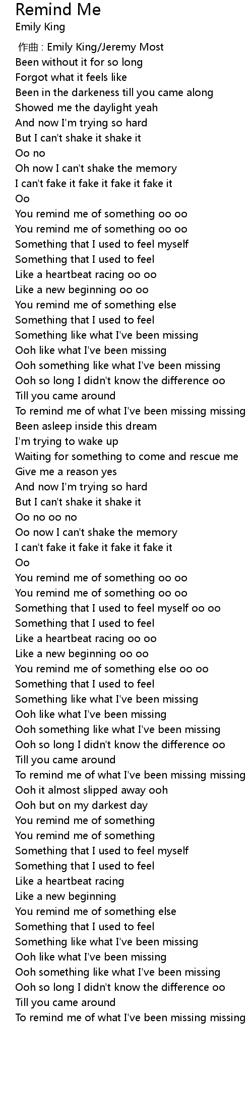 | [02:34.63] | To remind me of what I' ve been missing missing |