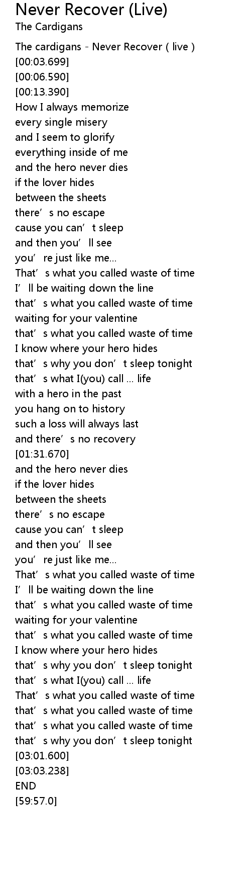 | [00:01.500] | The cardigans - Never Recover(live) |