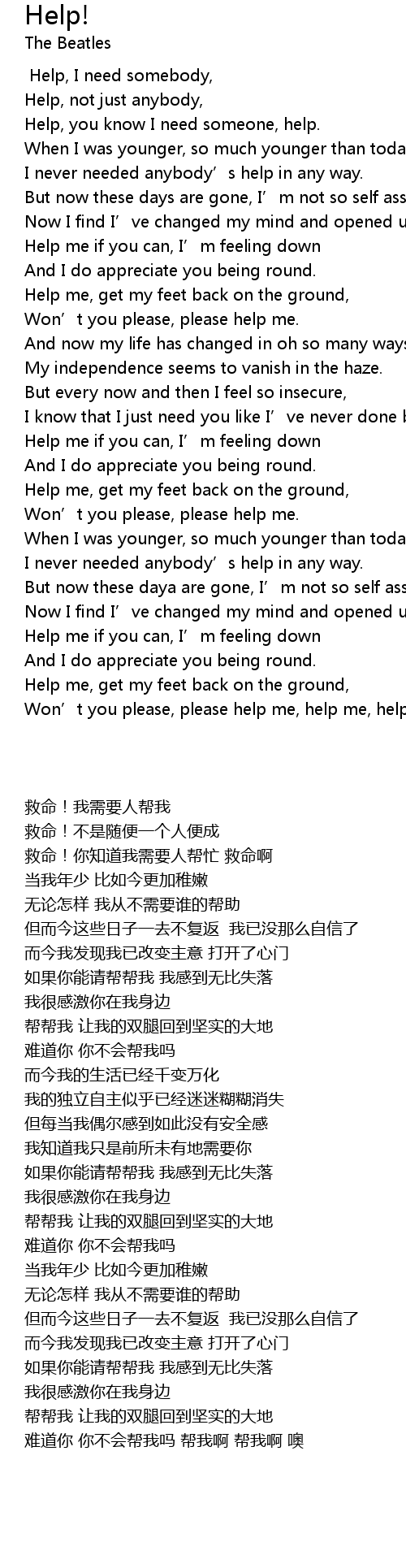 | [00:05.58] | Help, you know I need someone, help. |