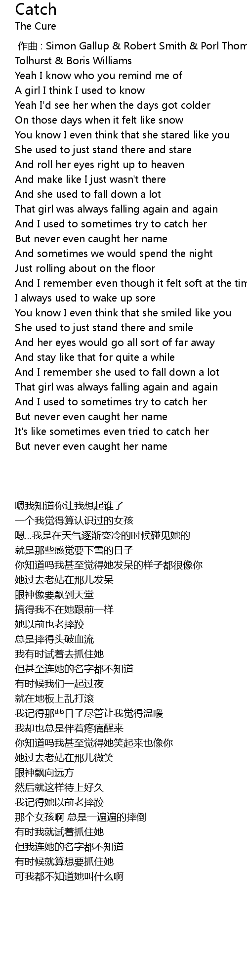 | [00:00.00] | 作曲 : Simon Gallup & Robert Smith & Porl Thompson & Laurence Tolhurst & Boris Williams |