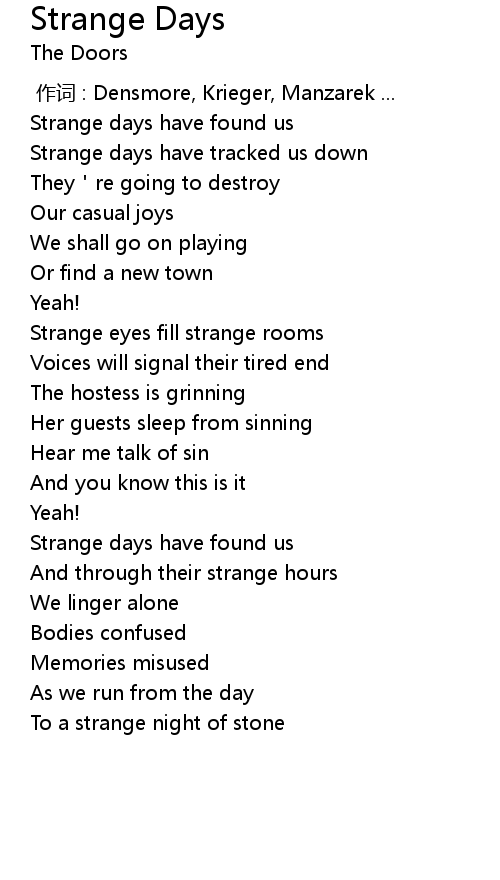 | [00:23.600] | Strange days have tracked us down |