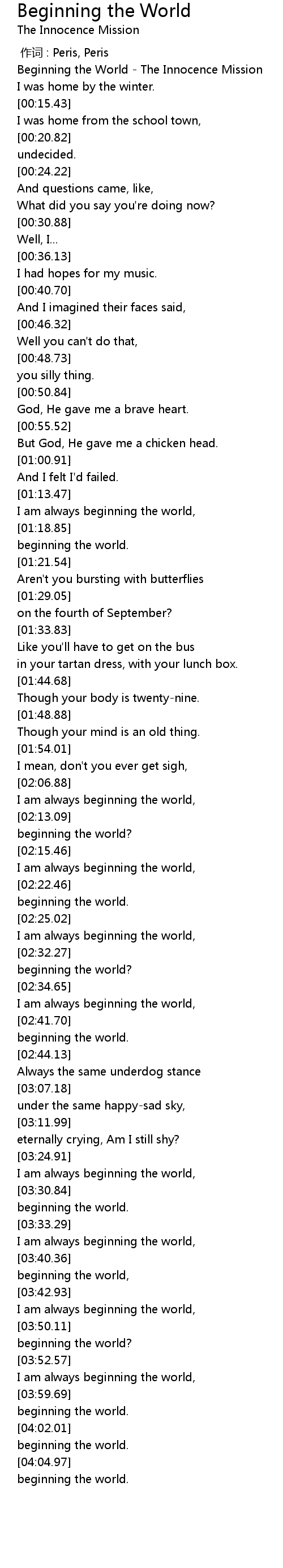 | [00:00.97] | Beginning the World The Innocence Mission |