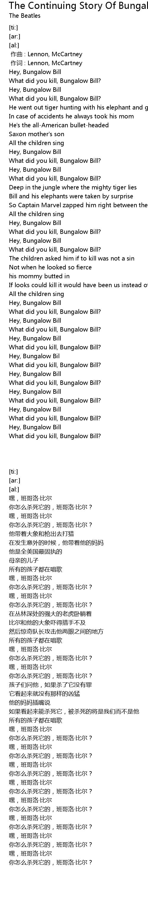 | [02:00.75] | Hey, Bungalow Bill |