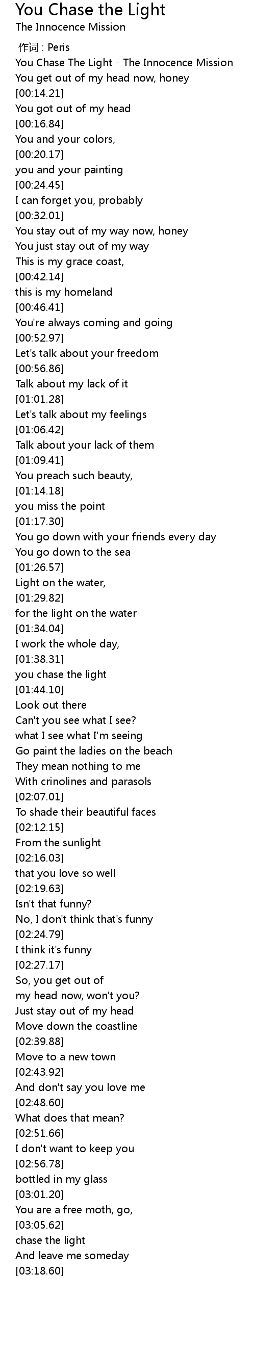 | [00:00.20] | You Chase The Light - The Innocence Mission |