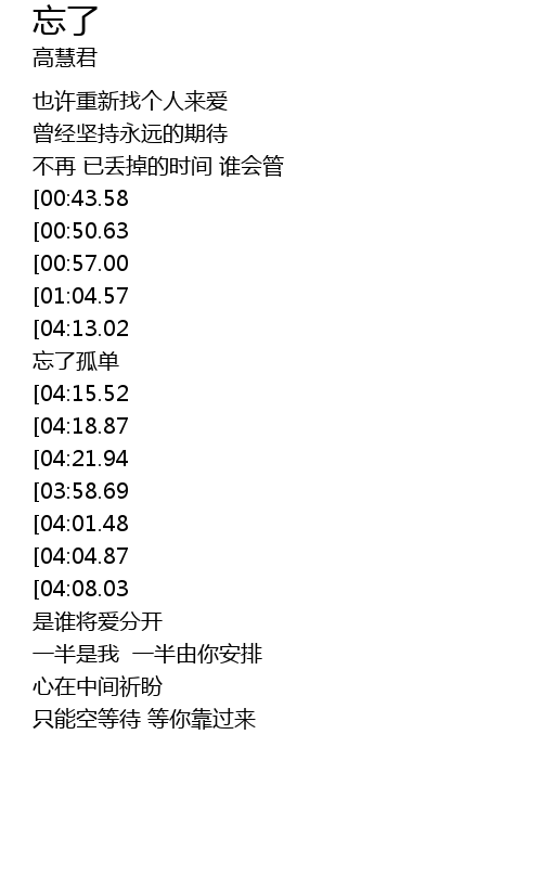 | [04:42.70][04:15.52][03:47.78][02:22.33][01:13.62] | 再忘了想 再忘了忘 |