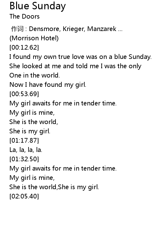 | [00:18.93] | I found my own true love was on a blue Sunday. |