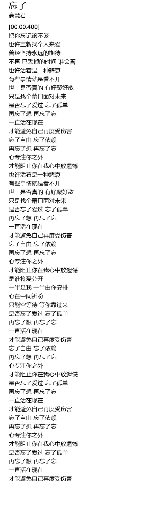 | [01:26.910] | 再忘了想 再忘了忘 |