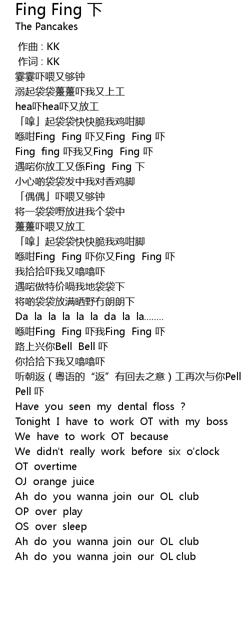 | [01:57.638] | 听朝返(粤语的“返”有回去之意)工再次与你Pell Pell 吓 |