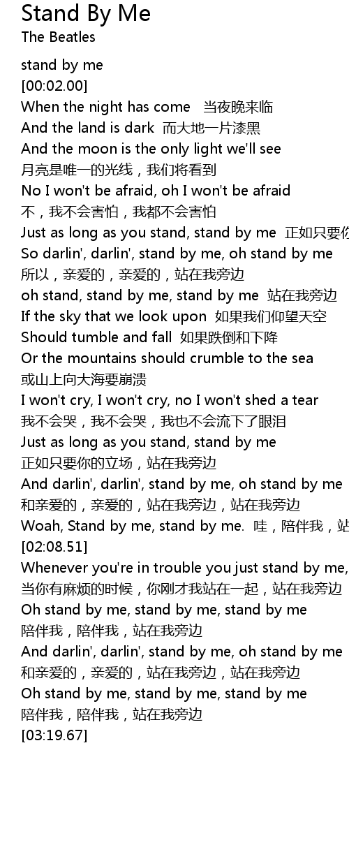 | [00:53.71] | So darlin', darlin', stand by me, oh stand by me suǒ yǐ, qīn ài de, qīn ài de, zhàn zài wǒ páng biān |