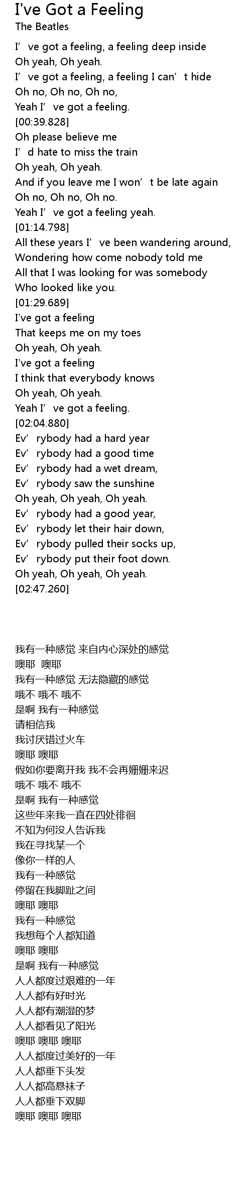| [00:21.800] | I’ve got a feeling, a feeling I can’t hide |