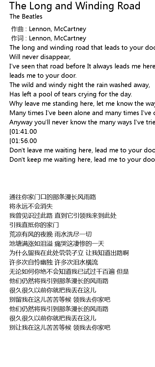 | [02:38.00][01:41.00] | Still they lead me back to the long and winding road |