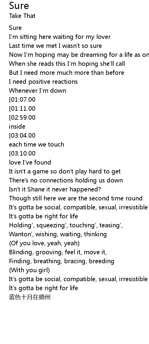 | [03:20.00][02:59.00][02:06.00][01:13.00][00:16.00] | Sure so sure so baby come on inside |