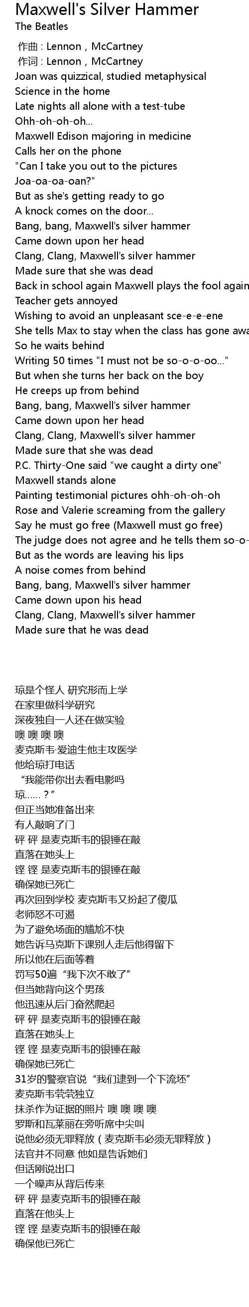 | [00:38.700] | Bang, bang, Maxwell' s silver hammer |