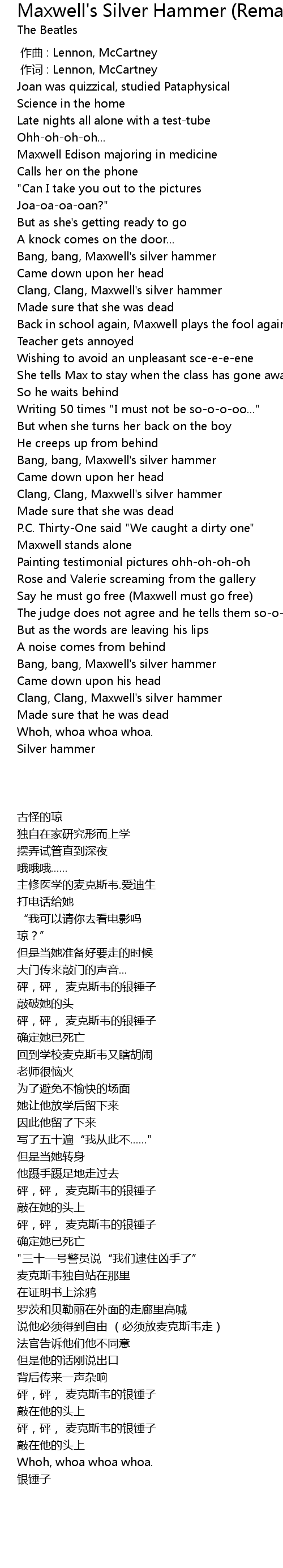 | [00:38.89] | Bang, bang, Maxwell's silver hammer |
