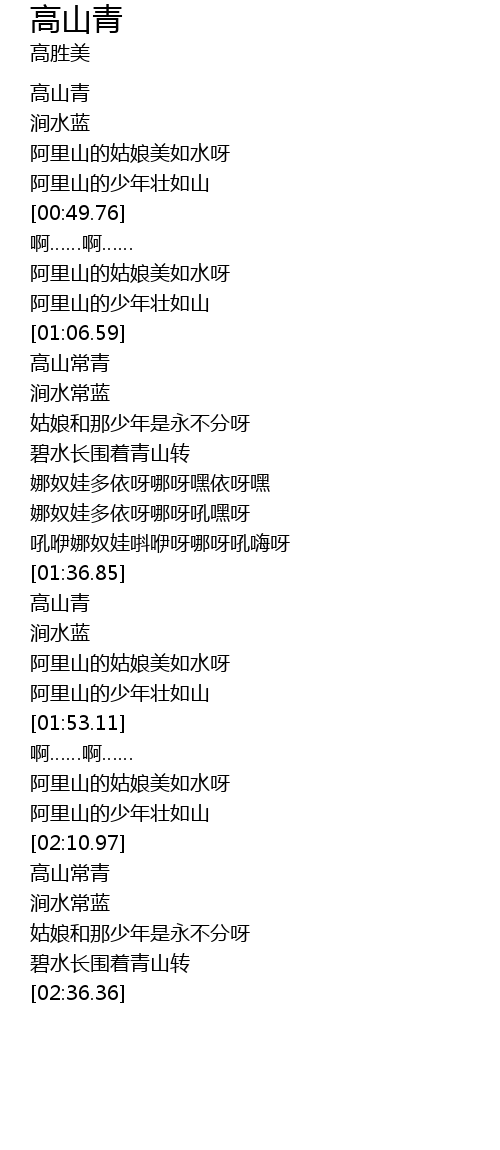 | [00:58.16] | 阿里山的姑娘美如水呀 |