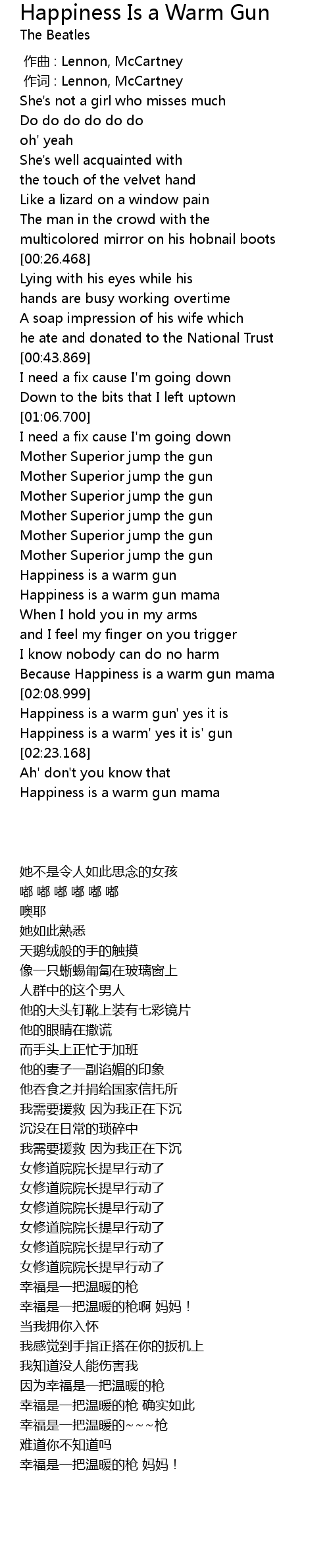 | [02:16.99] | Happiness is a warm' yes it is' gun |