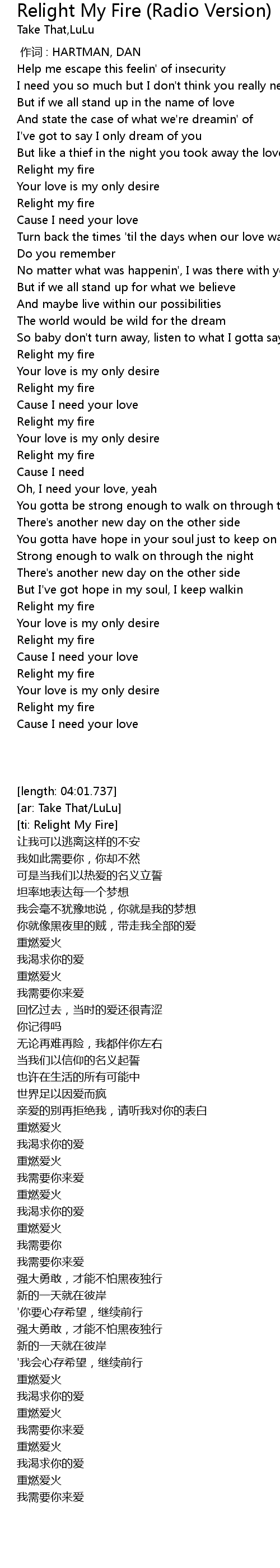 | [02:00.758] | Relight my fire |
