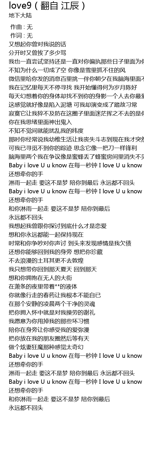 | [02:36.38] | Baby i love U u know zài měi yī miǎo zhōng I love U u know hái xiǎng qiān nǐ de shǒu |