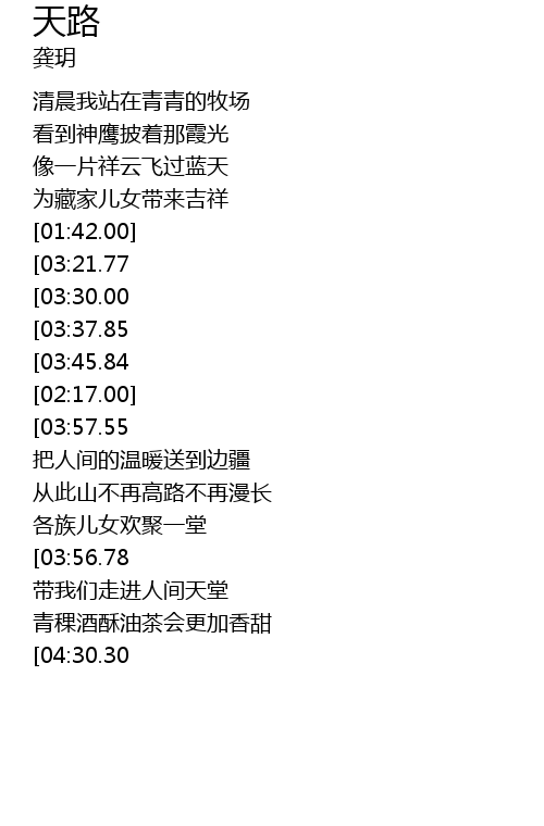 | [02:17.39][03:57.55] | 那是一条神奇的天路 哎~~~ |