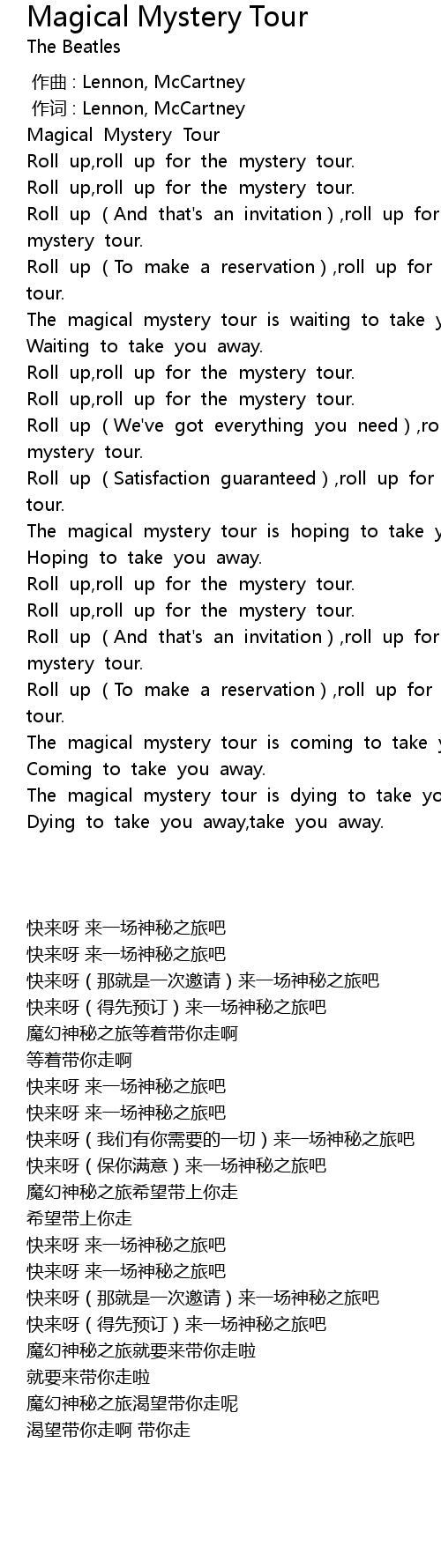 | [00:58.182] | Roll up (Satisfaction guaranteed),roll up for the mystery tour. |