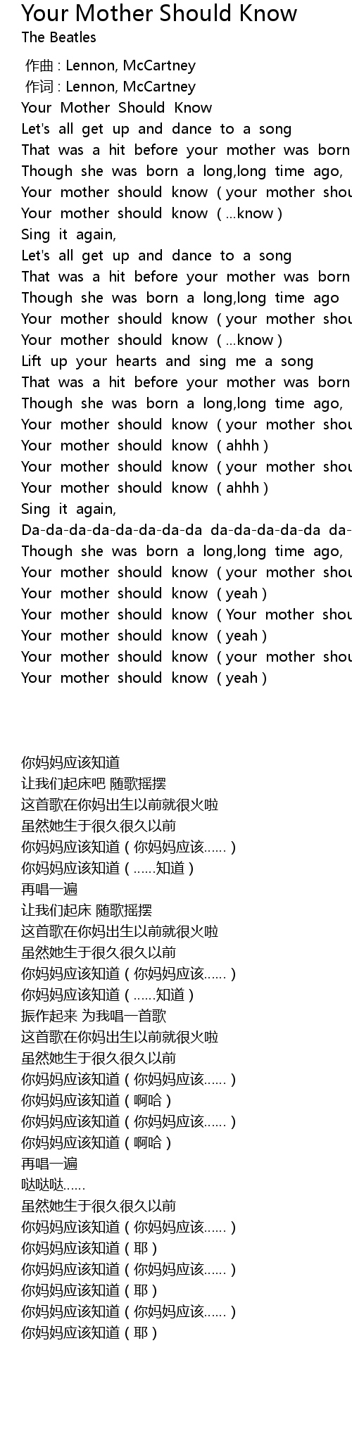 | [02:07.92] | Your mother should know (Your mother should...) |