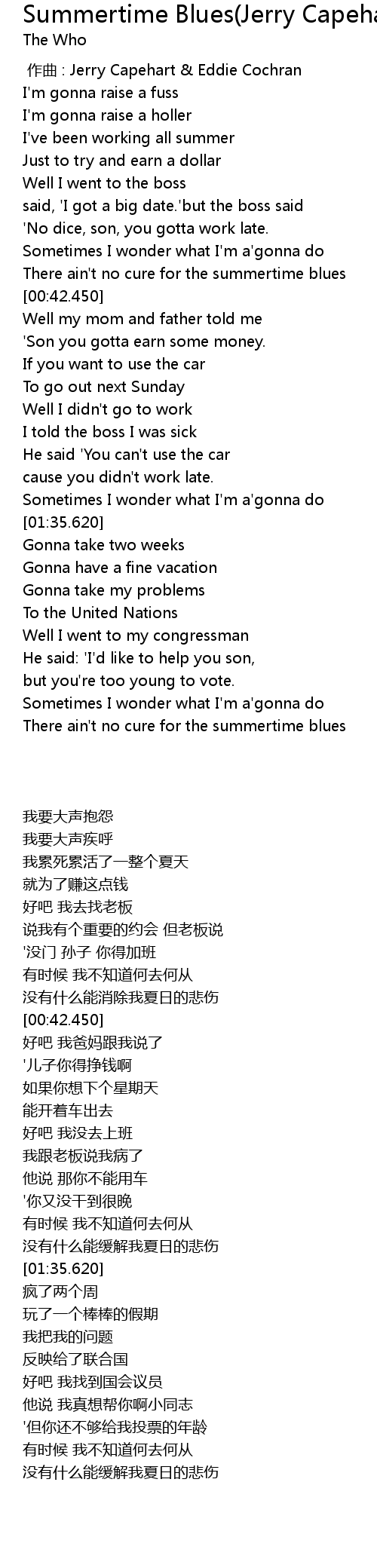 | [00:39.490] | There ain't no cure for the summertime blues |