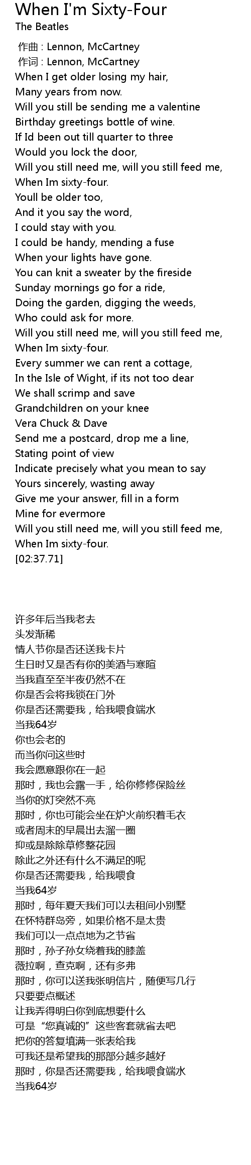 | [02:24.84] | Will you still need me, will you still feed me, |