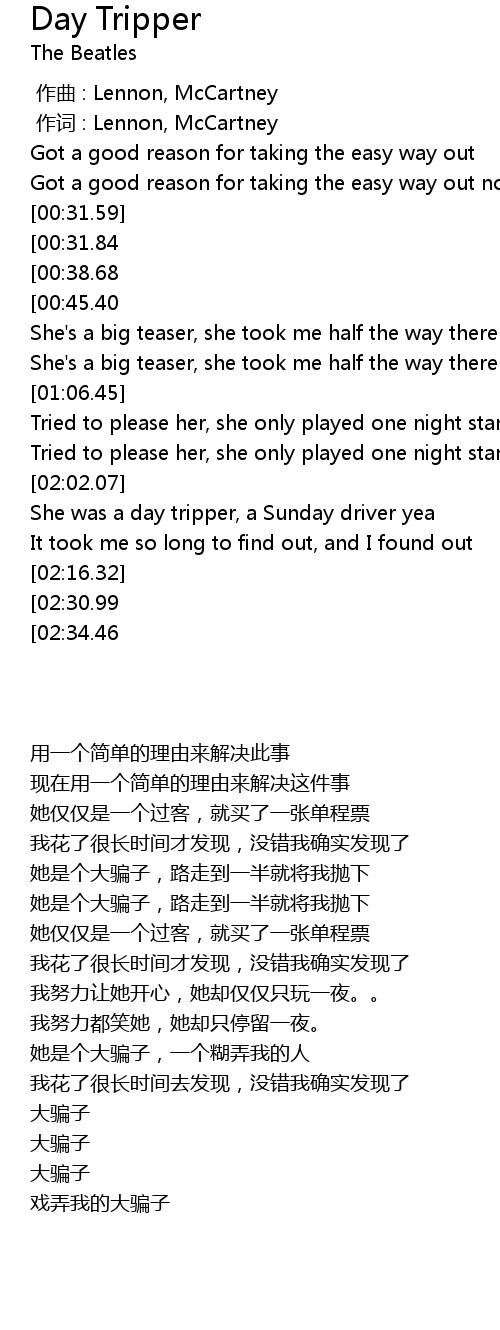 | [01:06.67][00:31.84] | She was a day tripper, a one way ticket yea |