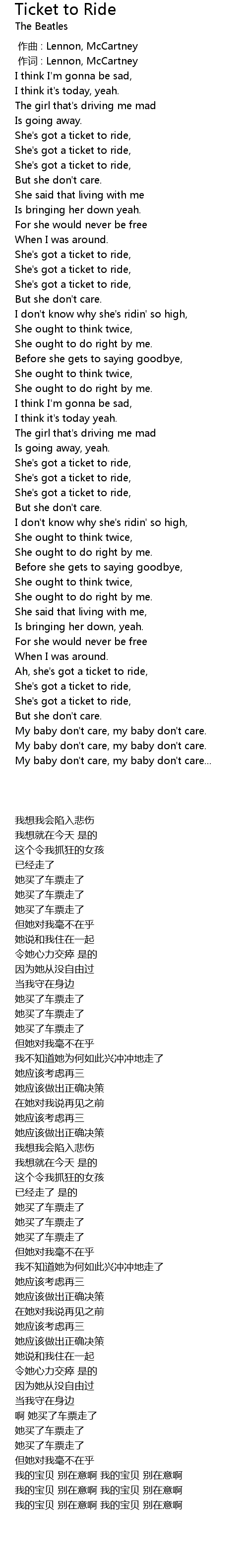 | [02:31.000] | Ah, she' s got a ticket to ride, |