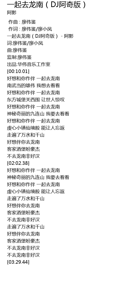 | [00:02.30] | 一起去龙南(DJ阿奇版) - 阿影 |