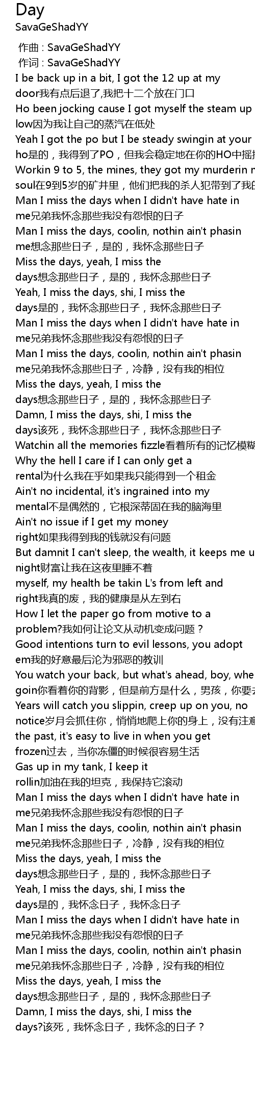 | [01:56.07] | Damn, I miss the days, shi, I miss the days?该死,我怀念日子,我怀念的日子? |