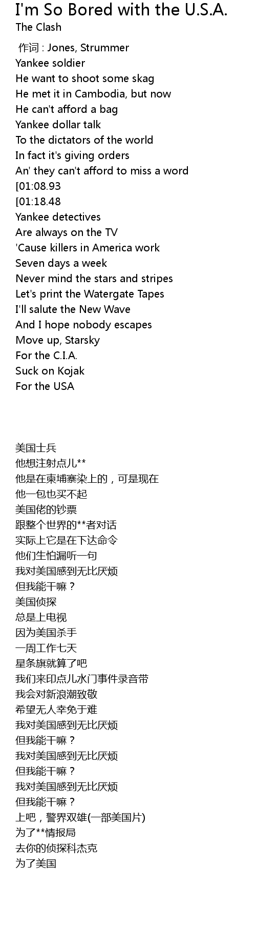 | [00:35.16][01:08.93][01:28.78][01:50.84] | I' m so bored with the U. S. A. |