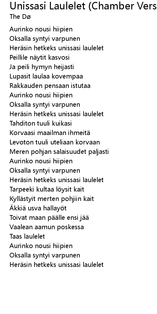 | [02:09.54] | Her sin hetkeks unissasi laulelet |