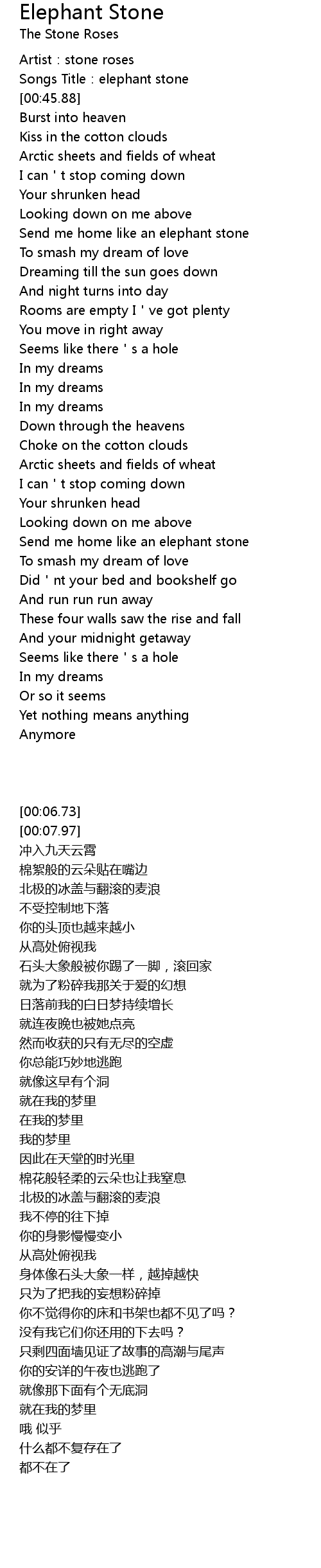 | [00:07.97] | Songs Title:elephant stone |