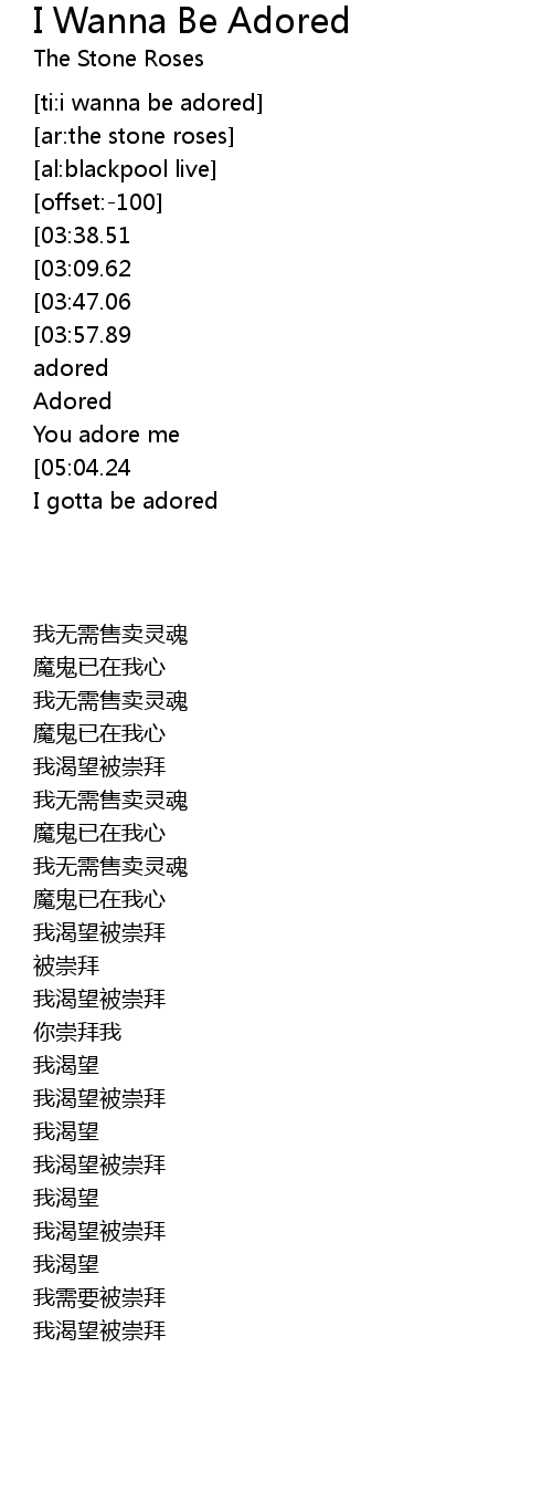 | [03:14.79][03:57.89][04:44.75][05:02.27][05:06.57][05:10.55][05:36.35] | I wanna be adored |