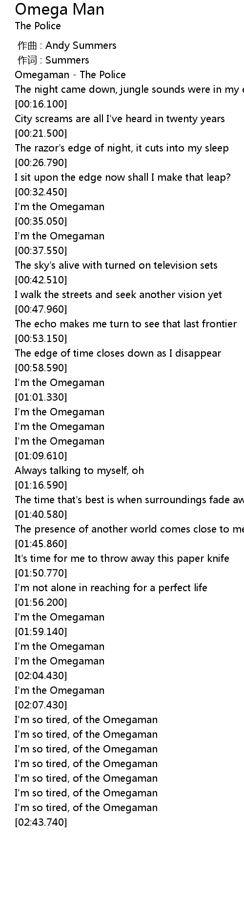 | [00:00.500] | Omegaman - The Police |