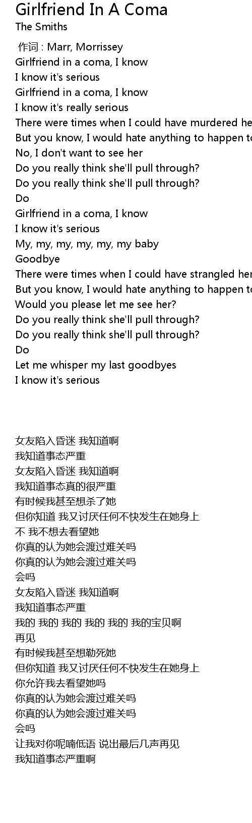 | [00:12.47] | Girlfriend in a coma, I know |