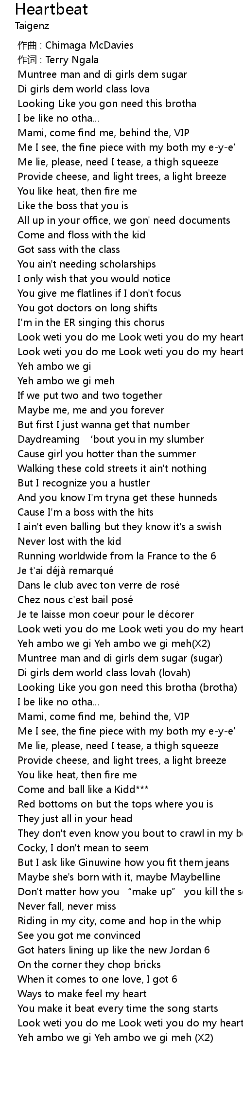 | [02:03.334] | Look weti you do me Look weti you do my heartbeat(X2) |