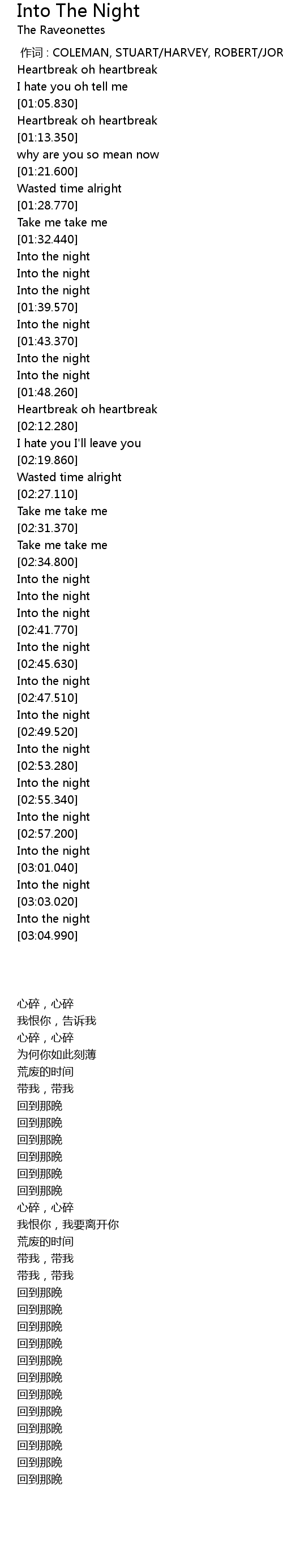 | [03:00.020] | Into the night |