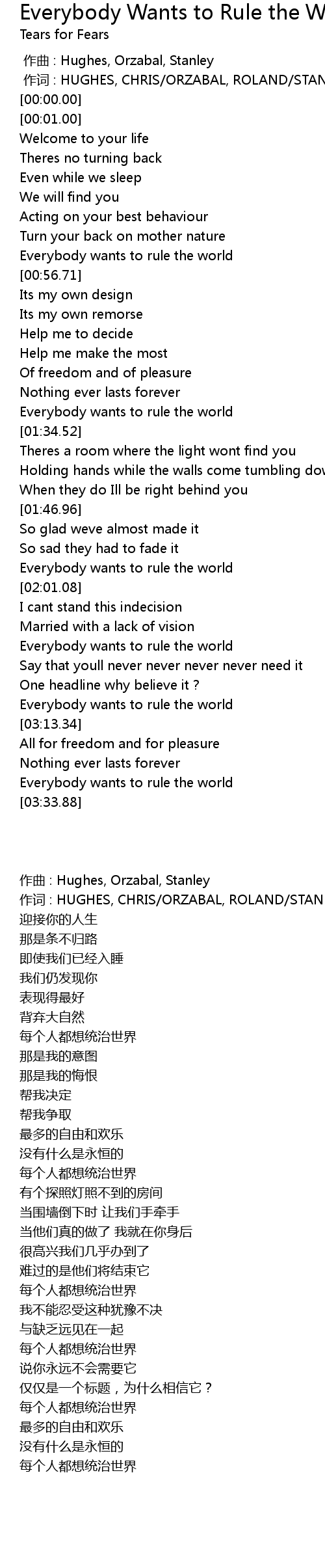 | [00:00.00] | 作曲 : Hughes, Orzabal, Stanley |