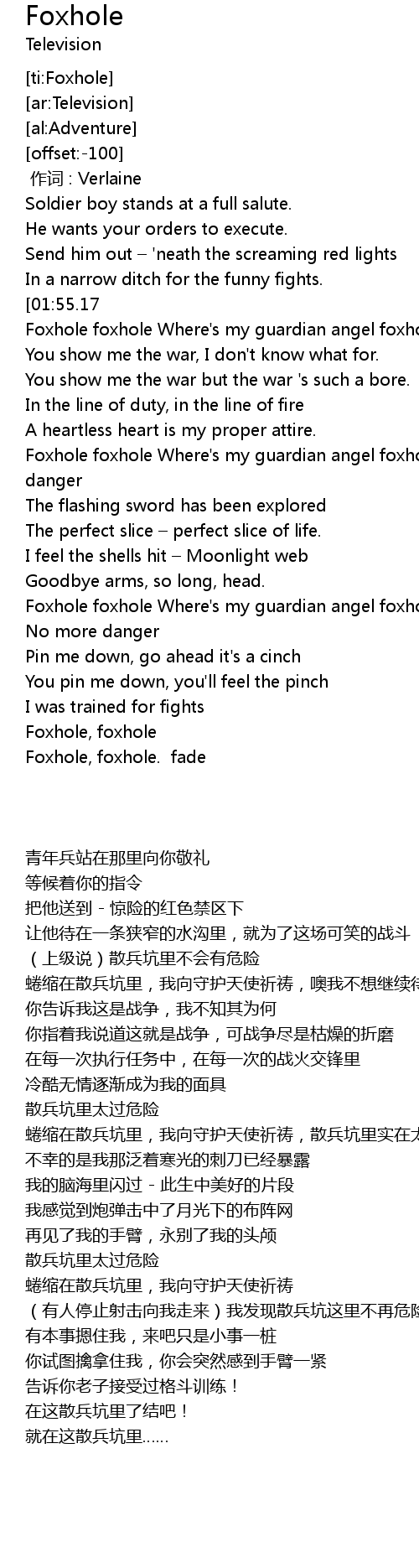 | [01:58.99] | Foxhole foxhole Where's my guardian angel foxhole foxhole no more danger |