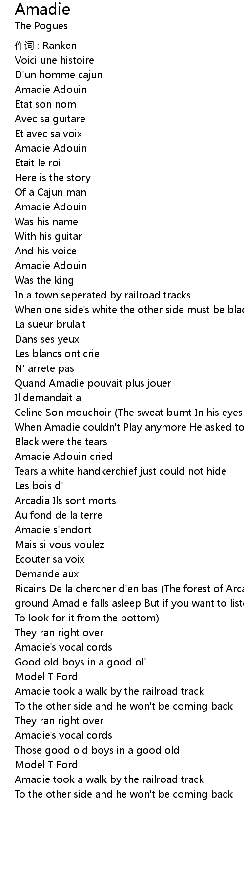 | Ricains De la chercher d'en bas (The forest of Arcadia Is dead Deep under the ground Amadie falls asleep But if you want to listen To his voice Ask the Yanks To look for it from the bottom) | |